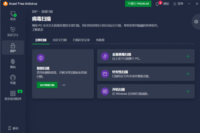 1、病毒扫描功能。一款优秀的杀毒软件不会等到病毒已经入侵了,甚至已经开始发挥作用了才开始拦截,Avast不仅可以杀灭已经存在于电脑中的病毒,还能够帮助我们提前预防,通过Avast的病毒扫描功能,可以随时检查电脑中有没有潜伏的病毒或者可疑文件,如果发现了这样的文件,Avast就会及时报告,提醒我们删除这些文件。