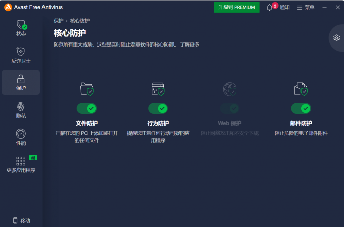 2、核心防护功能。核心防护功能主要由三个部分组成,文件防护、行为防护以及邮件防护,通过这三个层面的防护,能够给我们的电脑建立起一套完善、有效的实时防护体系。之所以强调是实时防护,是因为Avast确实能做到实时监控,当我们下载了风险文件时,Avast就会立刻提示我们,帮助我们规避电脑病毒风险。