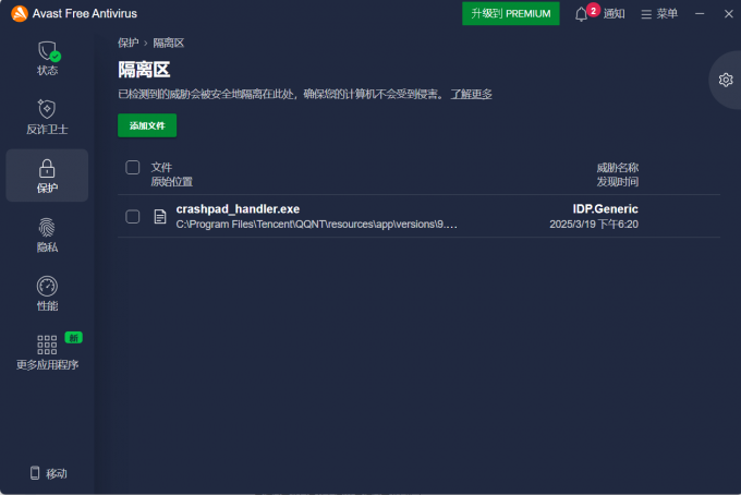 3、隔离区功能。隔离区功能是Avast的特色功能,当Avast检测到有可疑文件或者电脑病毒时,就会把文件移到隔离区中,病毒在隔离区中无法对我们的电脑造成损害,我们可以定期打开Avast的隔离区,将这些可疑的文件进行筛选、删除即可。