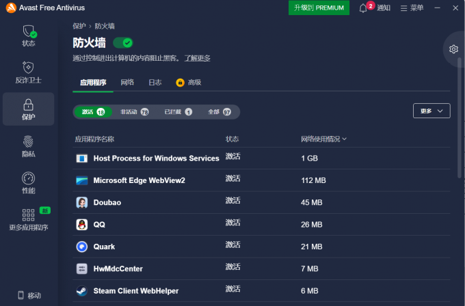 除了上面所说的几个功能之外,Avast还有防火墙的功能,Avast的防火墙功能主要针对的是电脑中的应用程序以及电脑连接的网络。我们在Avast的防护界面中可以找到防火墙功能。